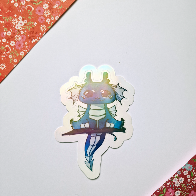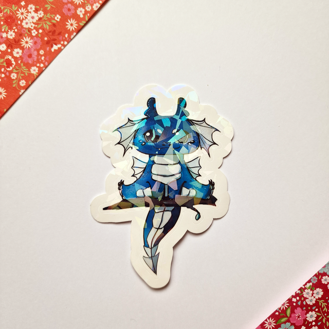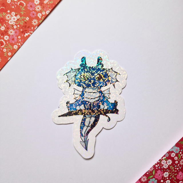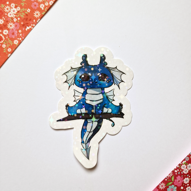 Autocollant sur papier Vinyle résistant à l'eau d'environ 7,5 cm de hauteur. Selon l'option choisie, le rendu est brillant, ou holographique arc-en-ciel / points / éclats / étoiles.